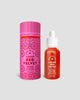 Jenna Rae Cakes’ Liquid Red Velvet - Package of 6 is displayed in pink and red cylindrical containers alongside stacked and broken red macarons and a small dropper bottle, all set against a pink background.